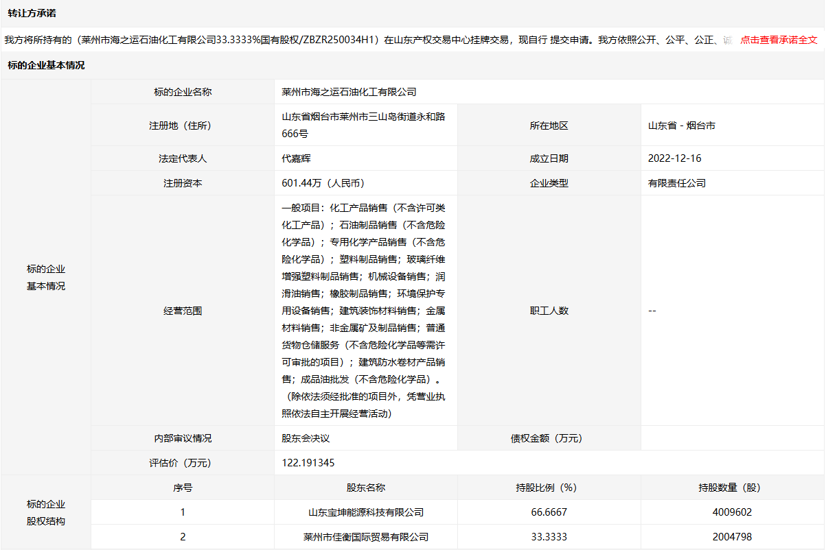 萊州市海之運(yùn)石油化工有限公司33.3333%國有股權(quán)