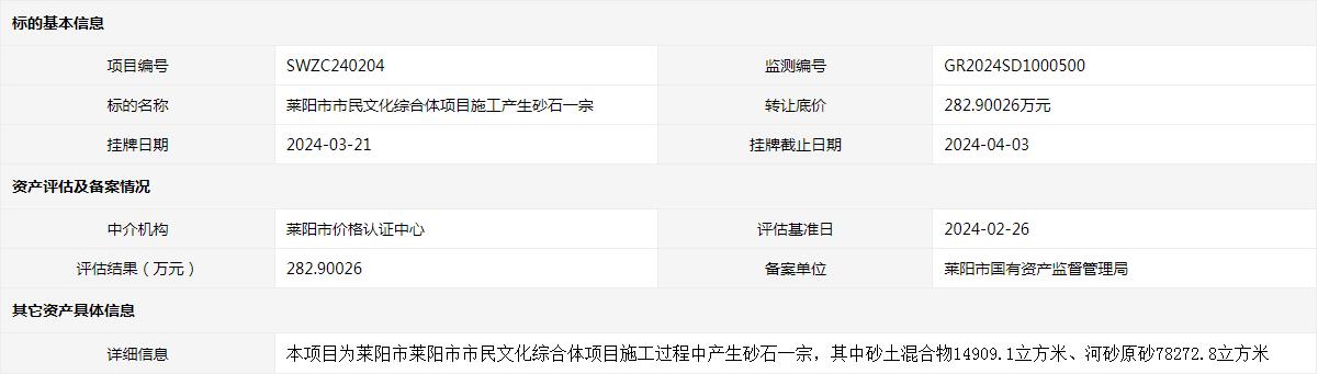 萊陽市市民文化綜合體項目施工產(chǎn)生砂石一宗