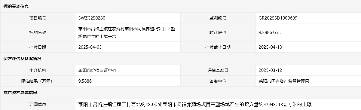 萊陽市呂格莊鎮(zhèn)汪家夼村萊陽市同福養(yǎng)殖場項(xiàng)目平整場地產(chǎn)生的土壤一宗