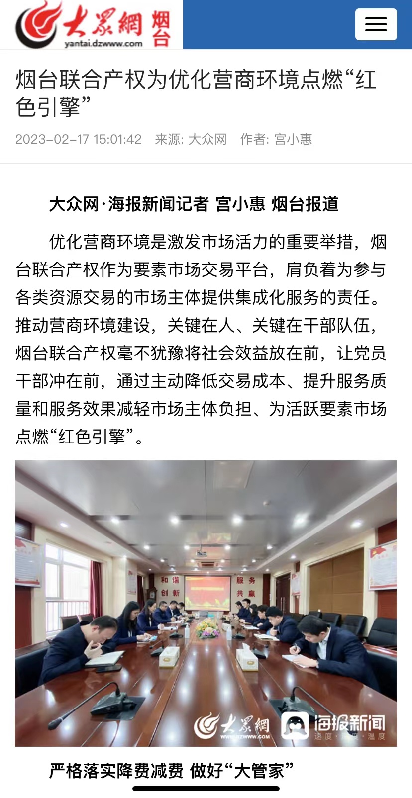 近日,“學(xué)習(xí)強(qiáng)國”煙臺(tái)平臺(tái)、煙臺(tái)日?qǐng)?bào)社大小新聞網(wǎng)、大眾網(wǎng)煙臺(tái)刊發(fā)署名文章《煙臺(tái)聯(lián)合產(chǎn)權(quán)為優(yōu)化營商環(huán)境點(diǎn)燃“紅色引擎”當(dāng)好市場(chǎng)“店小二”》,全面介紹了2022年煙臺(tái)聯(lián)合產(chǎn)權(quán)作為要素市場(chǎng)交易平臺(tái),肩負(fù)著為參與各類資源交易的市場(chǎng)主體提供集成化服務(wù)的責(zé)任,在推動(dòng)營商環(huán)境建設(shè)方面,毫不猶豫將社會(huì)效益放在前,讓黨員干部沖在前,通過主動(dòng)降低交易成本、提升服務(wù)質(zhì)量和服務(wù)效果減輕市場(chǎng)主體負(fù)擔(dān)、為活躍要素市場(chǎng)點(diǎn)燃“紅色引擎”。